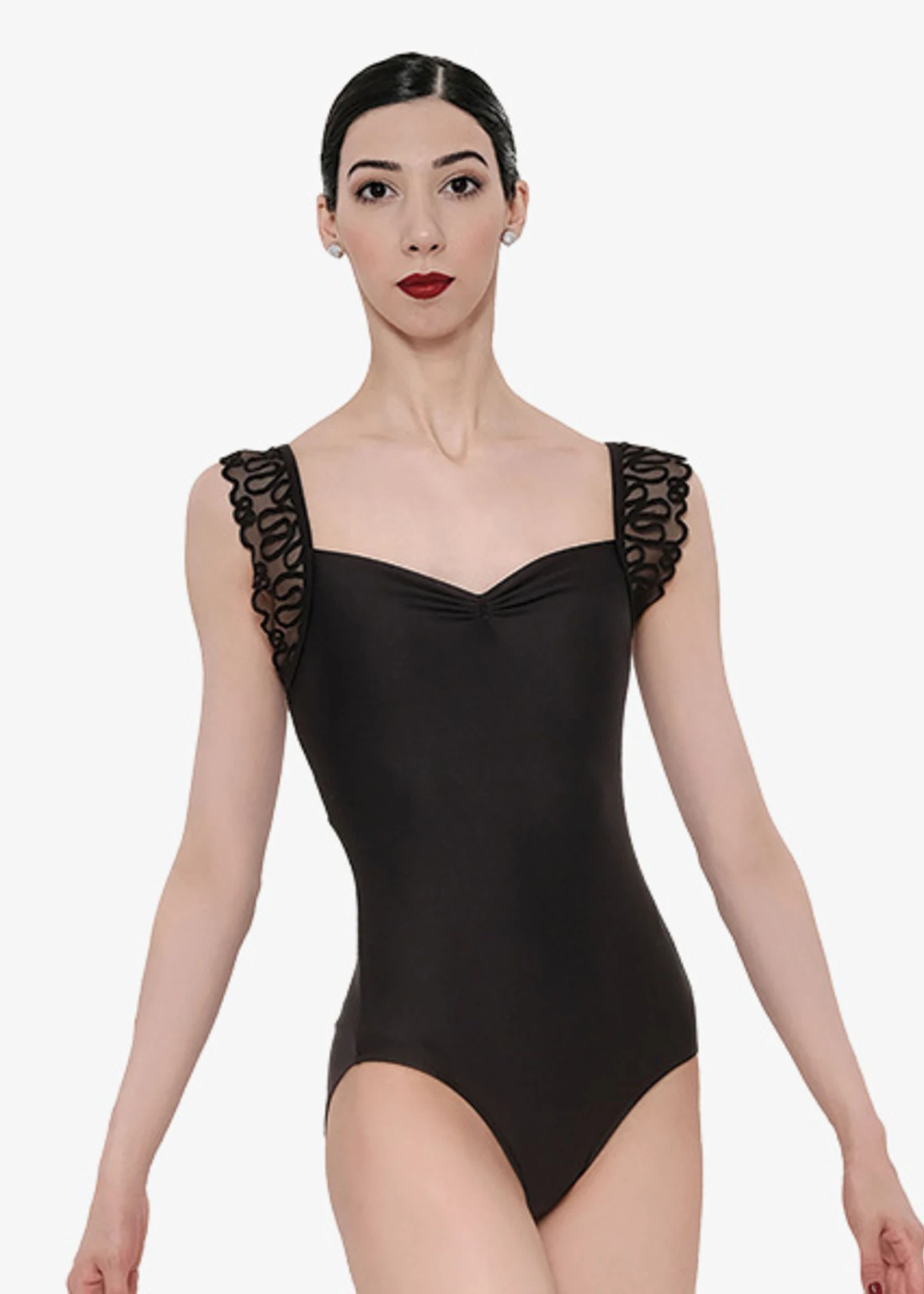 Pinch front leotard with embroidered flutter sleeve and matching back.