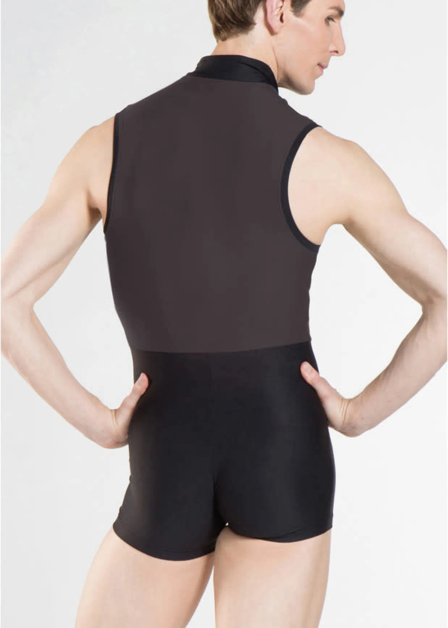 Men’s mock turtleneck, sleeveless biketard featuring a soft front zipper edging detail and a men’s leg cut.