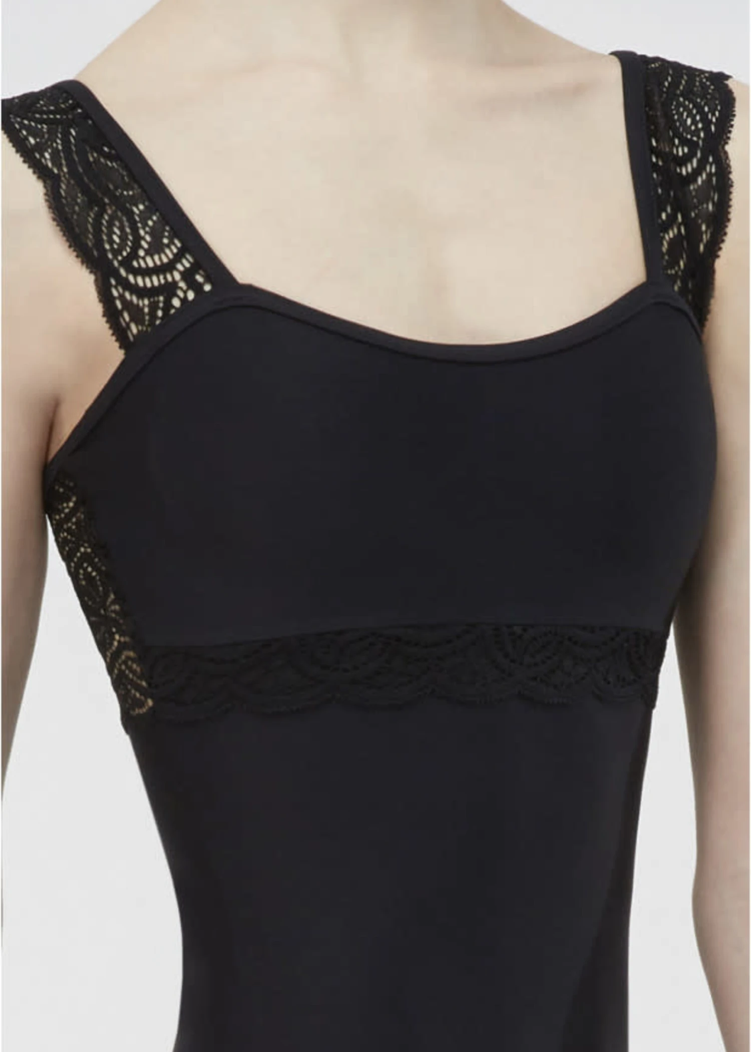 Tank leotard with a scalloped trim lace overlay.
