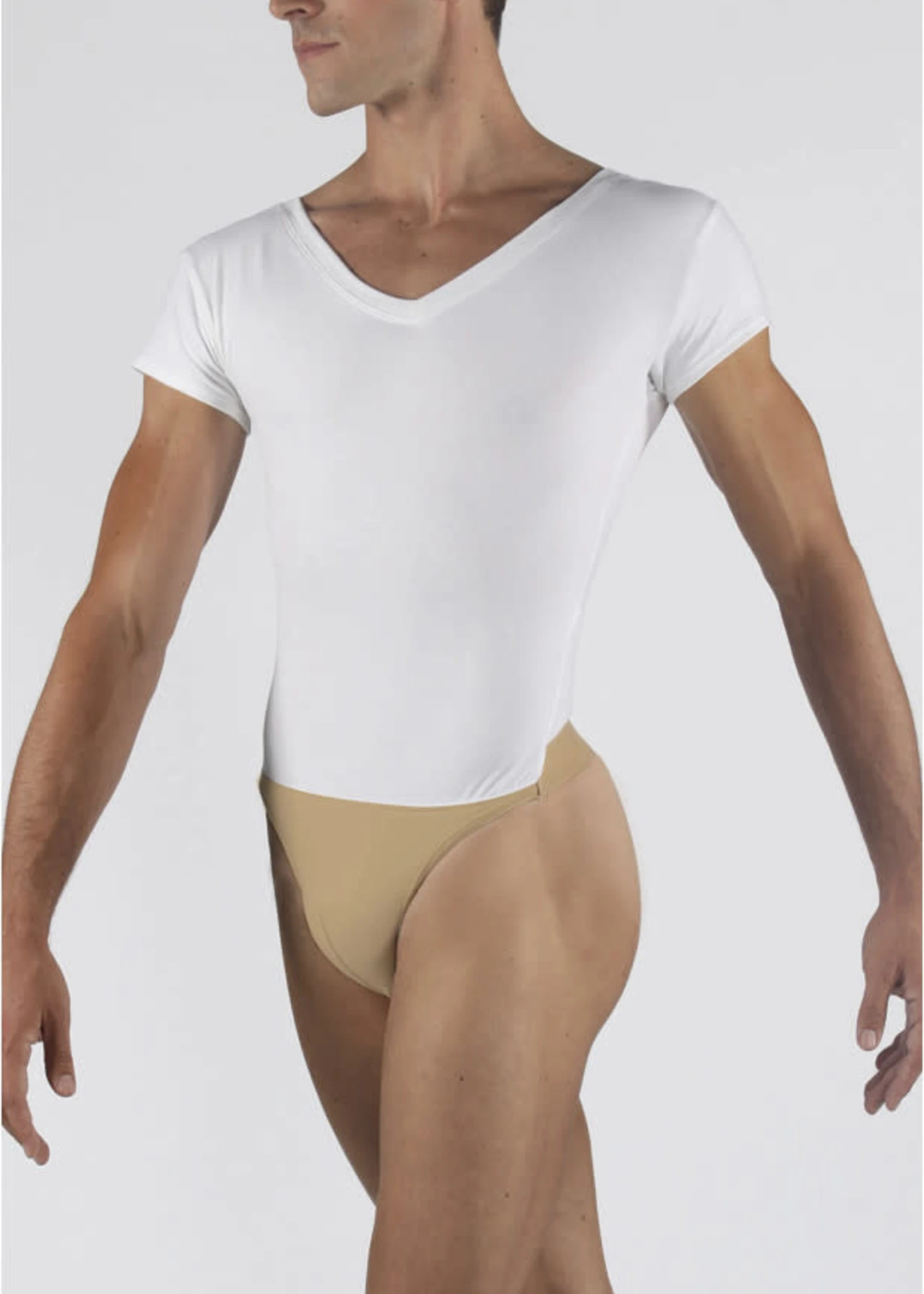 Short sleeve V-neck leotard features a built in fully front padded dancebelt with thong back. Cotton elasthan material.